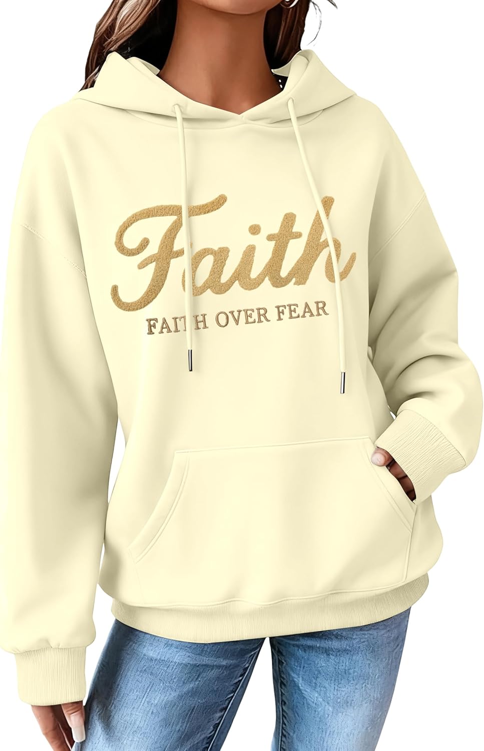 KIDDAD Faith Over Fear Hoodie Christian Sweatshirts Women Embroidered Religious Sayings Sweater Bible Pullover Tops