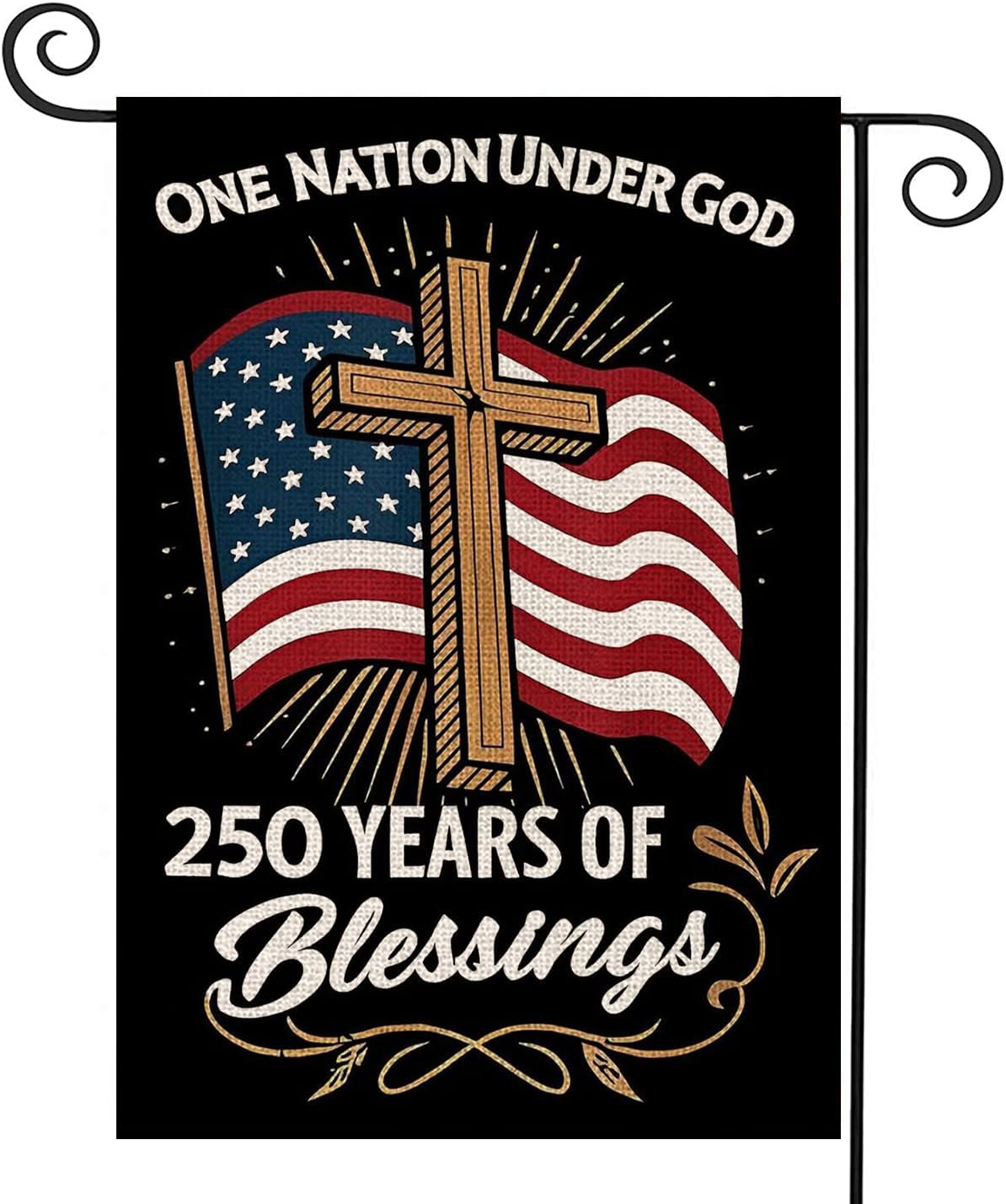 - PREMIUM DESIGN: Double-sided garden flag featuring the iconic patriotic cross and American flag design with 'ONE NATION UNDER GOD 250 Years of Blessings' message commemorating usa 250th anniversary
