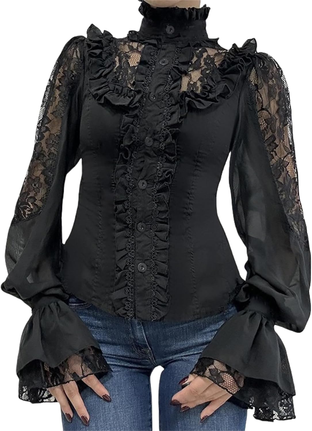 Vintage Top T Shirt Women Sheer Mesh Lace Mock Neck Goth Renaissance Punk Grunge Emo