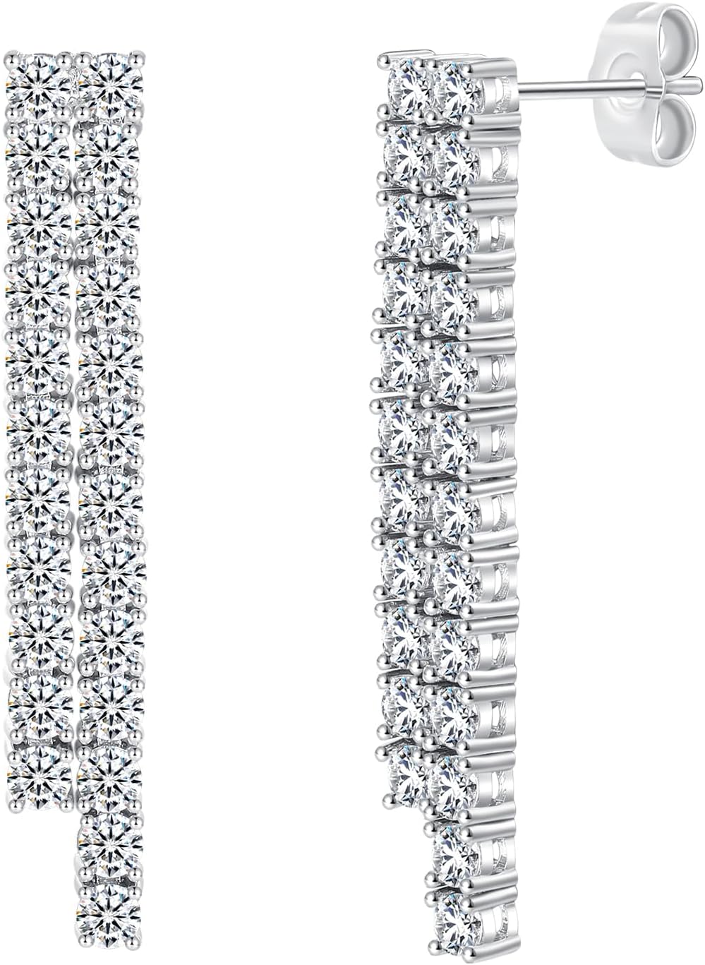 14K White Gold Drop Dangle Earrings, Double Row Linear 3mm Round Cubic Zirconias Tennis Drop Design, 1.7 inch Length