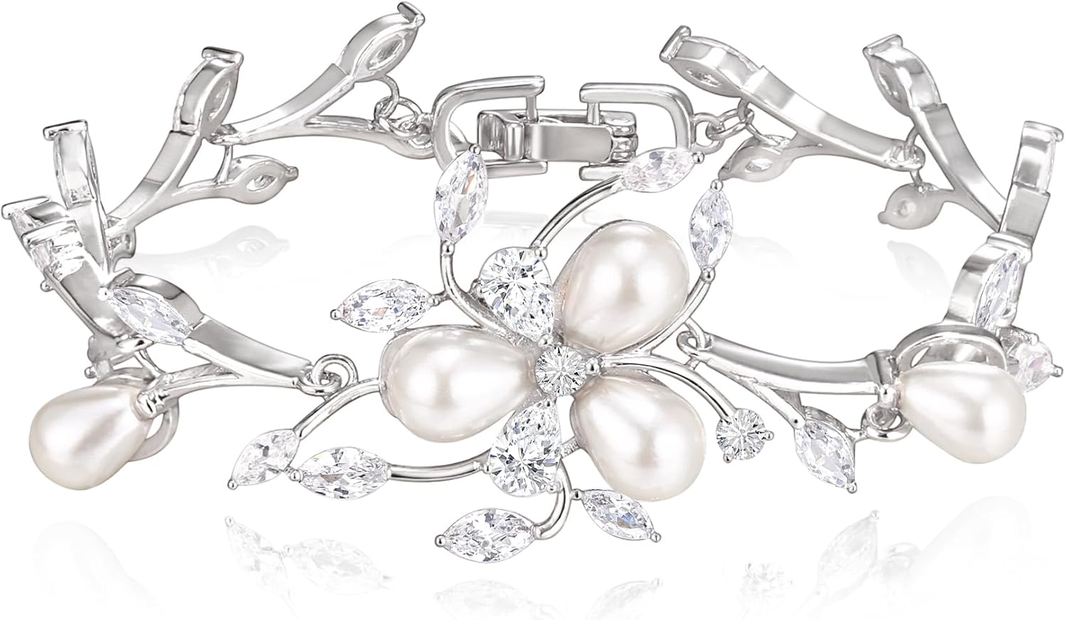 EVER FAITH Gorgeous Cubic Zirconia Wedding Jewelry for Bride Bridesmaid, Elegant Simulated Pearl Teardrop Tennis Bracelet Gift for Women