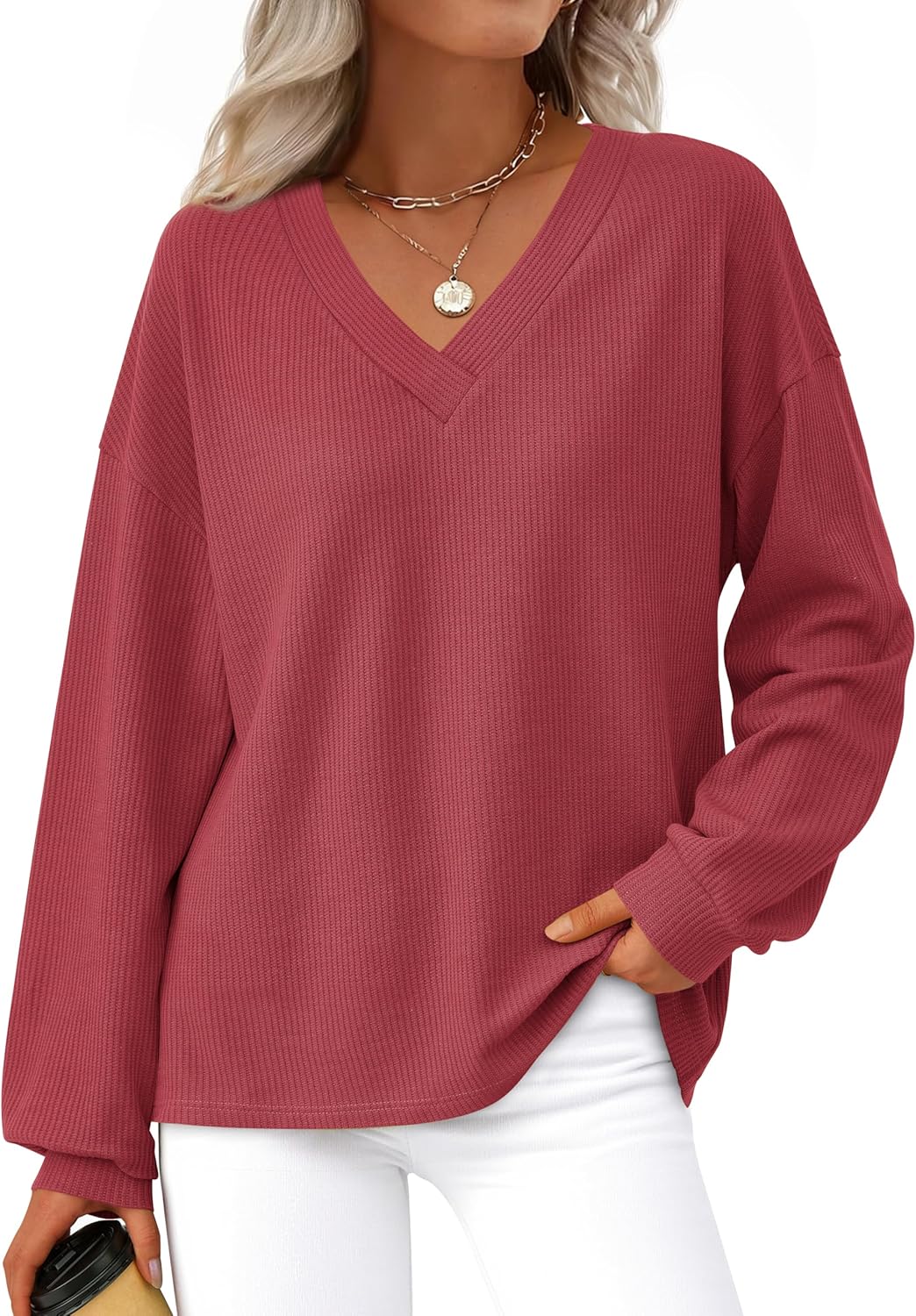 MASCOMODA Womens Tops Casual V Neck Waffle Knit Long Sleeve Shirts Trendy Loose Tunic Pullover Work Blouses Fall Outfits