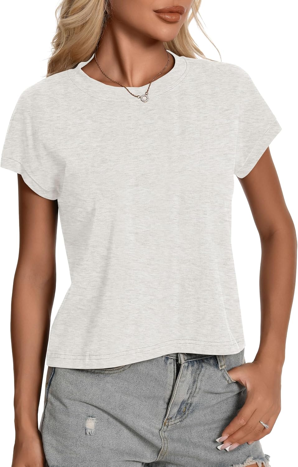 Womens Summer Tops, Cotton Crew Neck Cap Sleeve Loose Fit Shirts, Casual Trendy Lightweight Pullover Basic Tees