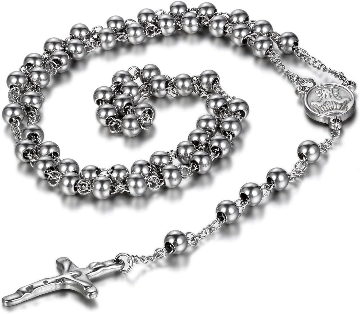 OIDEA Mens Womens Stainless Steel 8MM Beads Mary Jesus Crucifix Cross Rosary Necklace for Xmas Gift,Gold,Silver,Black Tone,with Gift Bag