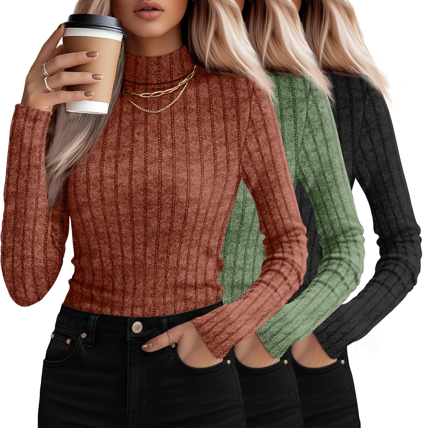 3 Pack Women's Mock Turtleneck Sweaters, Long Sleeve Ribbed Knit Tops, Fit Soft Thermal Underwear, Lightweight Fall Pullover(Rust Red, Green, Black,M)