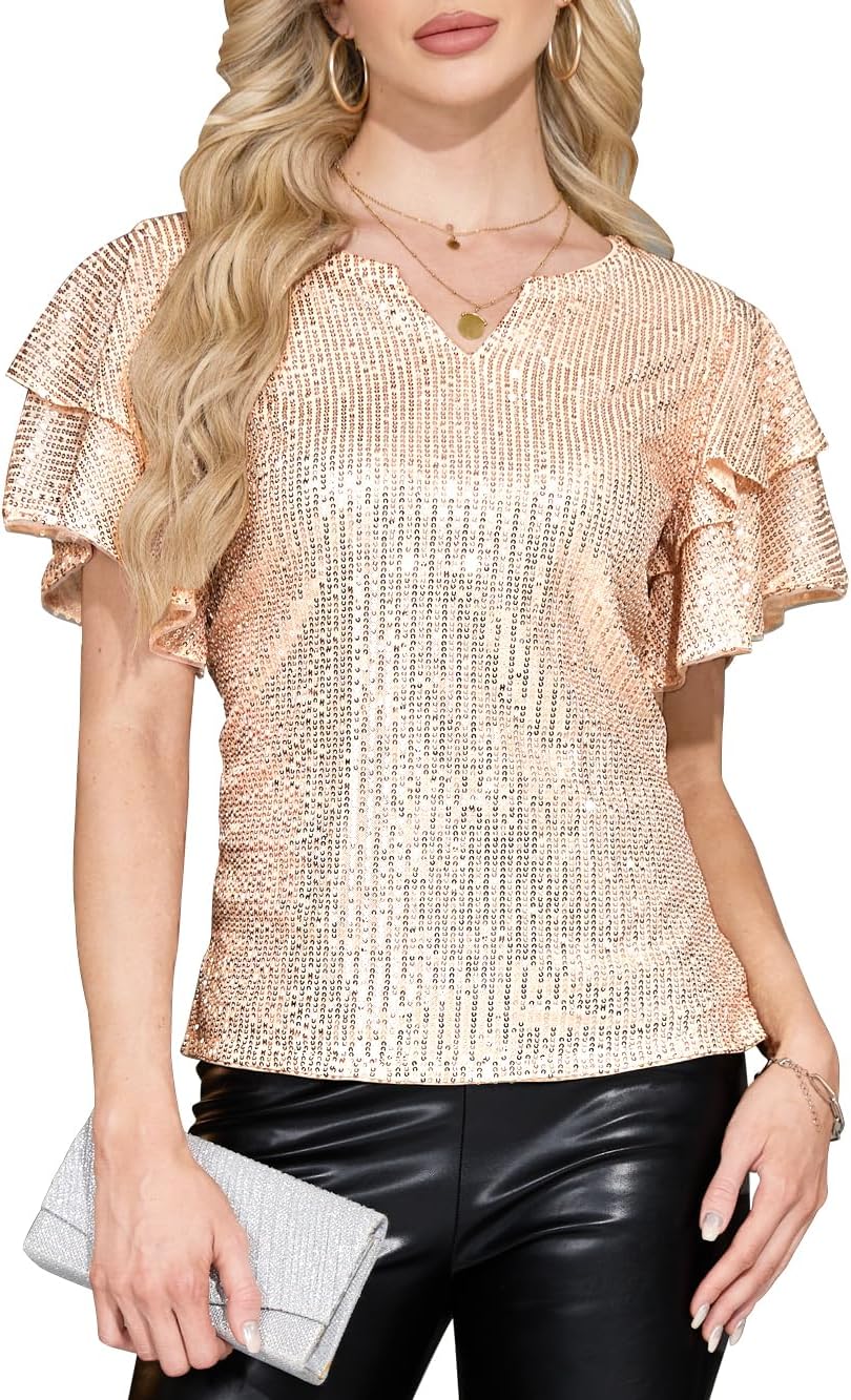 Women Sparkle Sequin Tops Glitter V Neck Blouse Tiered Ruffles Sleeve Cocktail Soiree Evening Party Disco Club Shirt