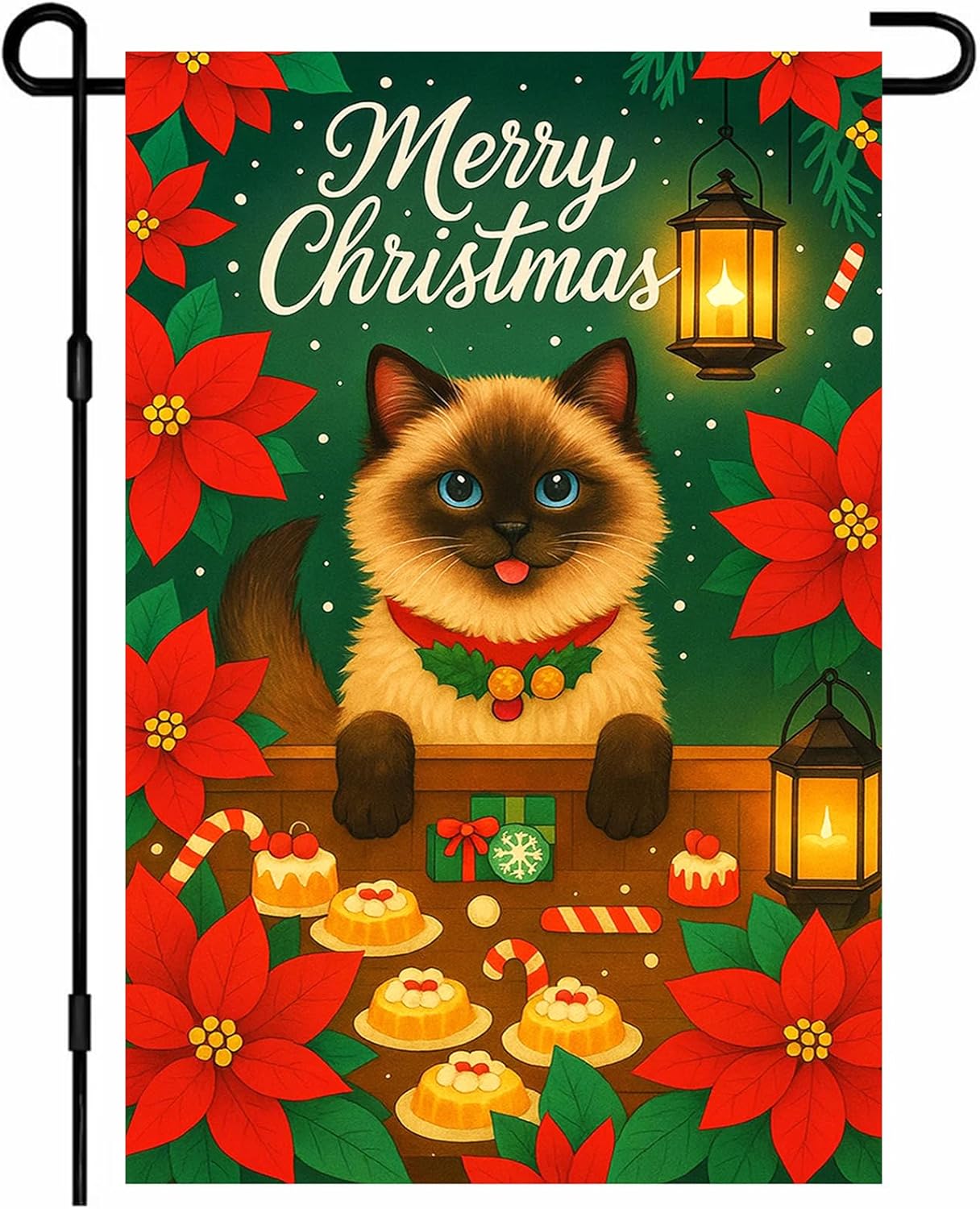 - Special Christmas Holiday Design: Featuring a charming Siamese cat dressed in a festive collar surrounded by poinsettias, cookies, candy canes, and glowing lanterns, this garden flag adds cozy Christmas warmth and delightful seasonal charm to your yard or porch décor.