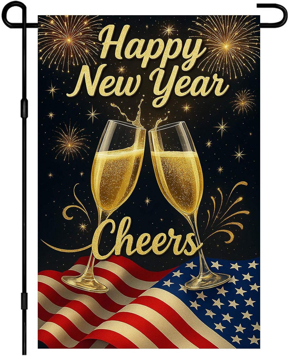 - Special New Year Design:two clinking glasses sparkle under fireworks above a red, white, and blue banner with “Happy New Year.” Dark sky and warm highlights create an elegant party look for porch, walkway, patio, or garden during the holiday season.