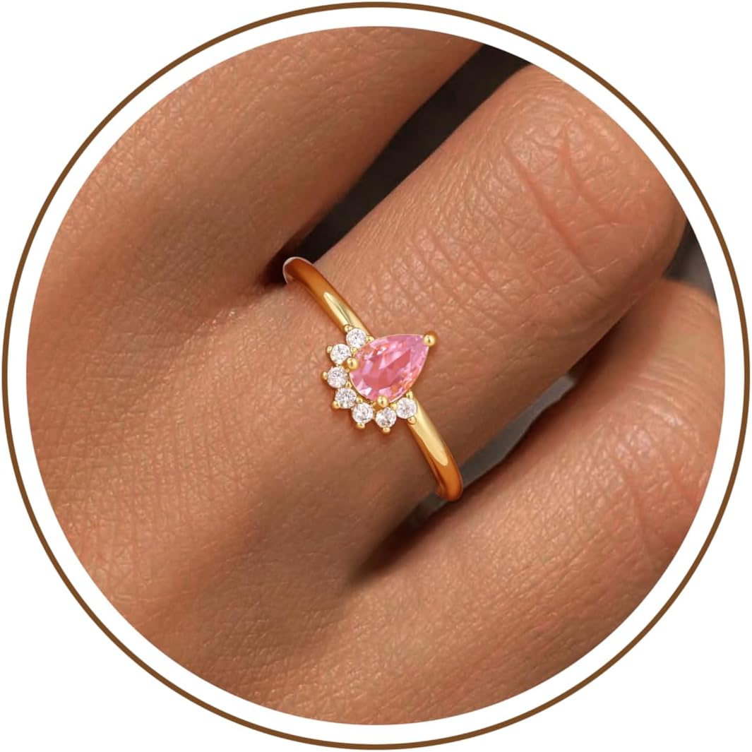 Gold Birthstone Rings for Women Non Tarnish Dainty 14K Gold Plated Rings Adjustable CZ Gemstone Rings Wedding Engagement Ring for her Birthday Gifts Jewelry