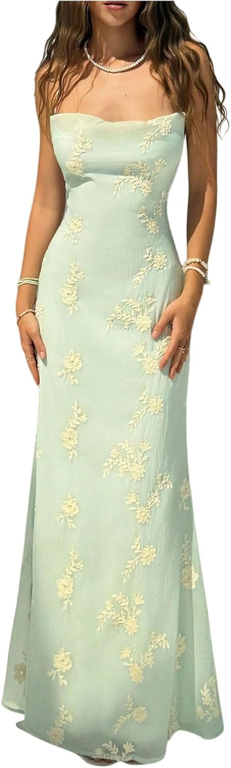 OYOANGLE Women's Spaghetti Strap Lace Up Backless Cami Dress Floral Embroidery Draped Fishtail Dresses