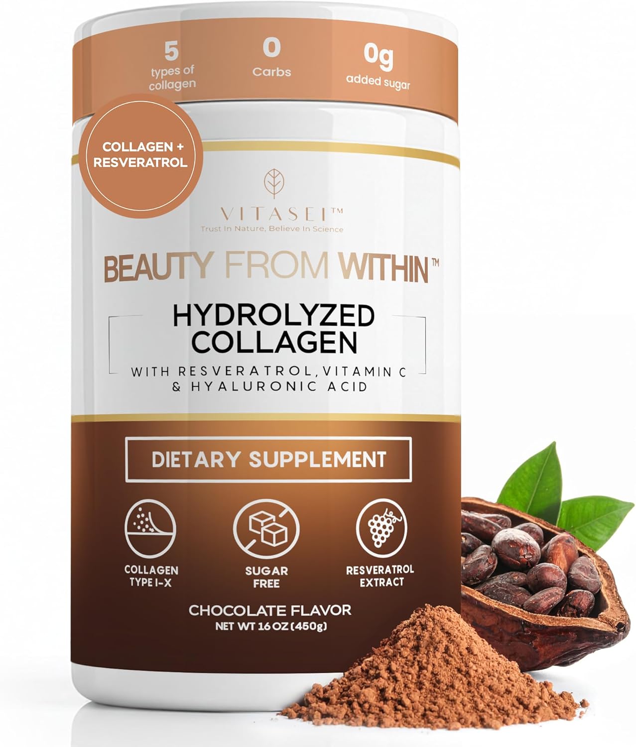 VITASEI Hydrolyzed Collagen Peptides Powder with Resveratrol & Vitamin C – Hair, Skin, Nails & Joint Support – Colágeno Hidrolizado for Women & Men – Delicious Chocolate Flavor, 16 oz (30 Servings)