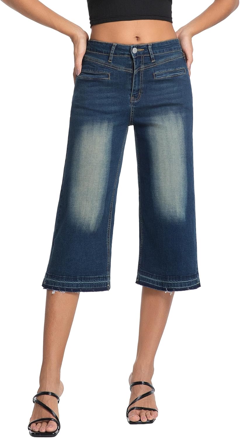 Womens Capris Wide Leg Stretchy High Waisted Frayed Hem Loose Denim Jeans