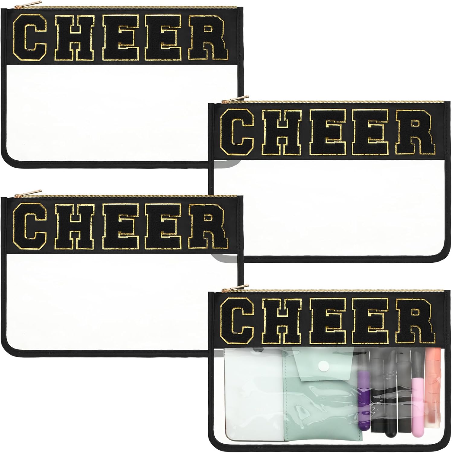 Abbylike 4 Pcs Cheer Makeup Bag Gift Set 11.8x8.2 Inches for Cheerleader Team Girls Clear Chenille Letter Cosmetic Bags Zipper Toiletry Makeup Pouch Bulk Women Travel Snack Bag(Black,Cheer)