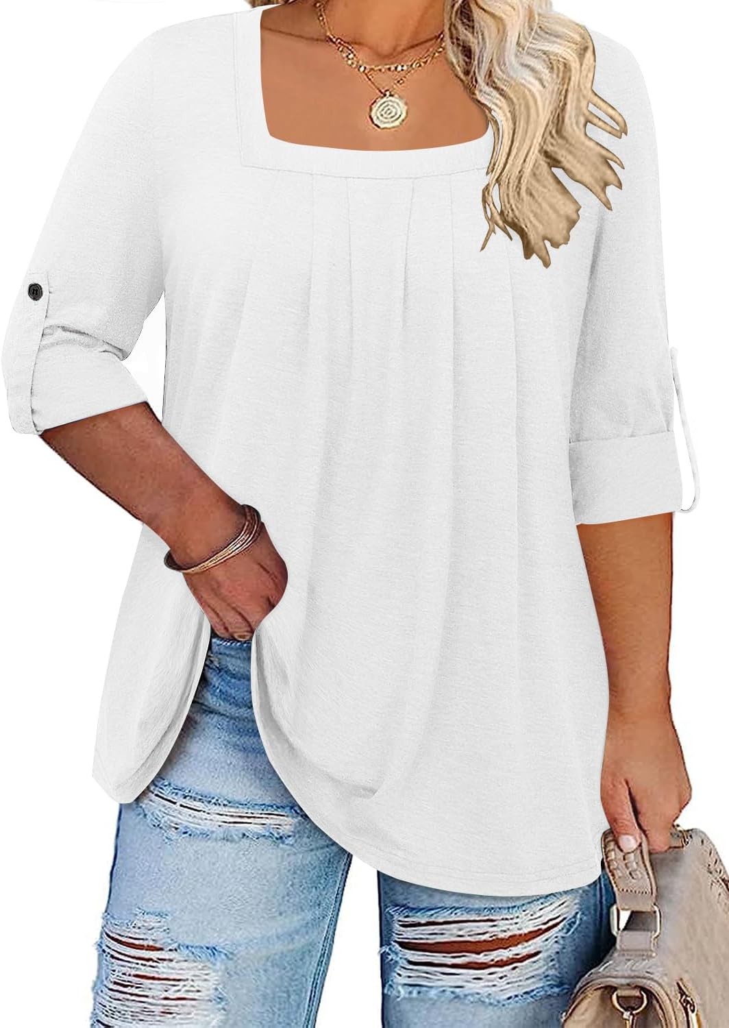Kancystore Women's Plus Size 3/4 Sleeve Tops Square Neck Shirts Loose Spring Work Tunic Blouses