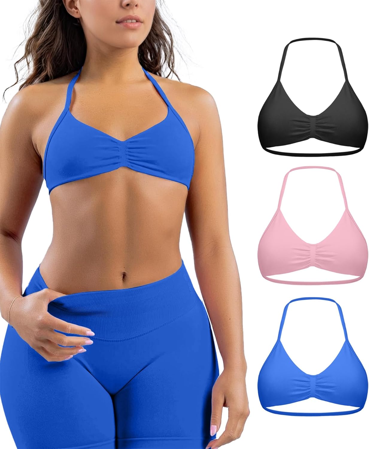 Comper Women's 3 Pack Strappy Bras Halter Bra Seamless Open Back Sports Bras Casual Bralette Crop top with Removable Cups