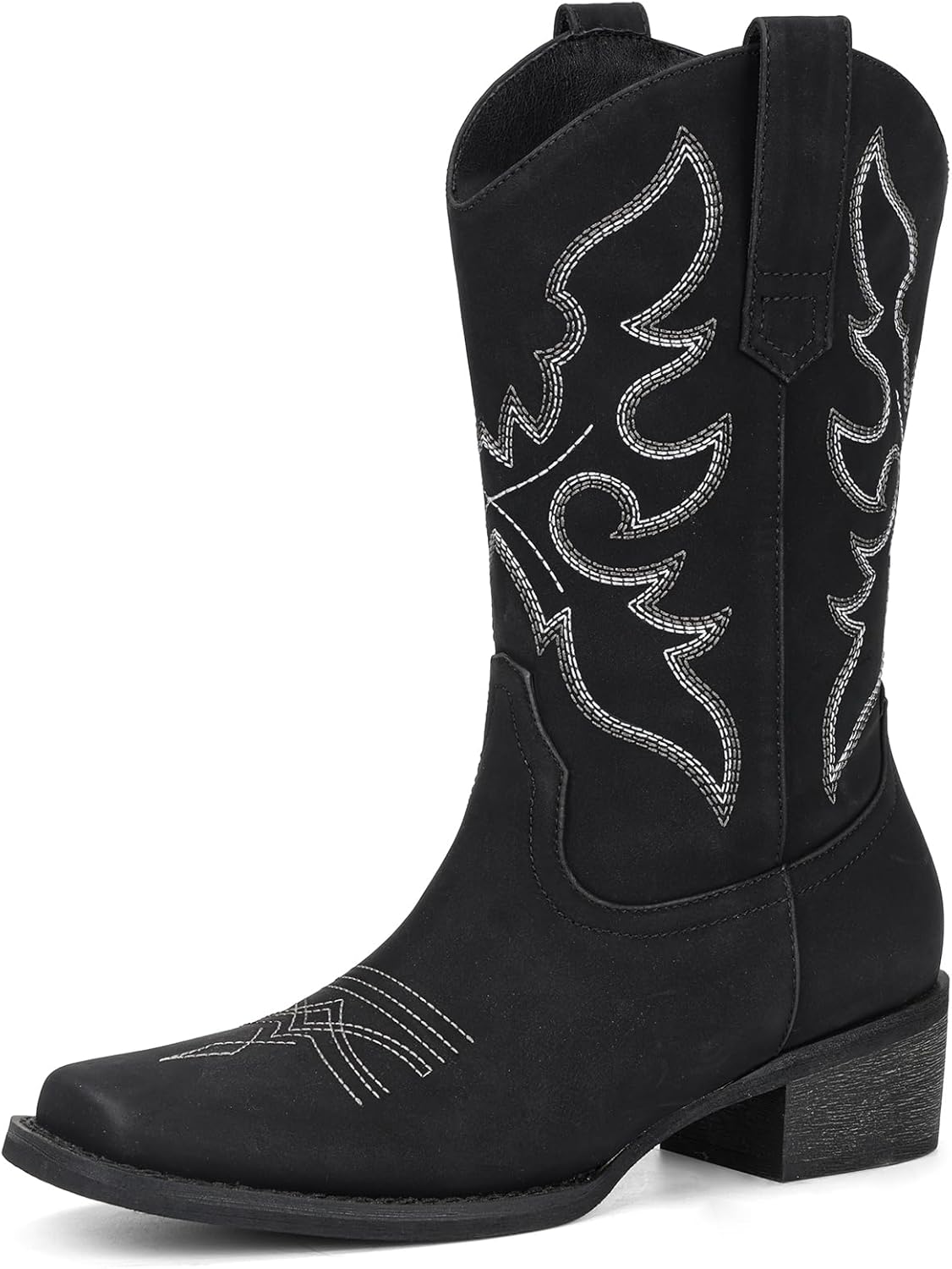 Cowboy Boots for Women Square Toe - Mid Calf Western Cowgirl Boots with Embroidery, Pull On Low Chunky Heel Fashion Footwear for Daily Casual Party Country Concert Rodeo