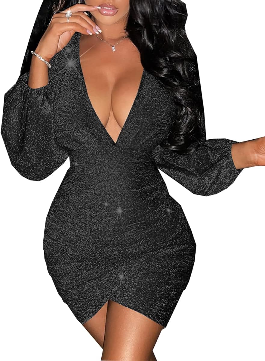 Sexy Sparkly Bodycon Dress for Women - Long Sleeve Deep V Neck Ruched Sequin Casual Club Midi Pencil Dresses