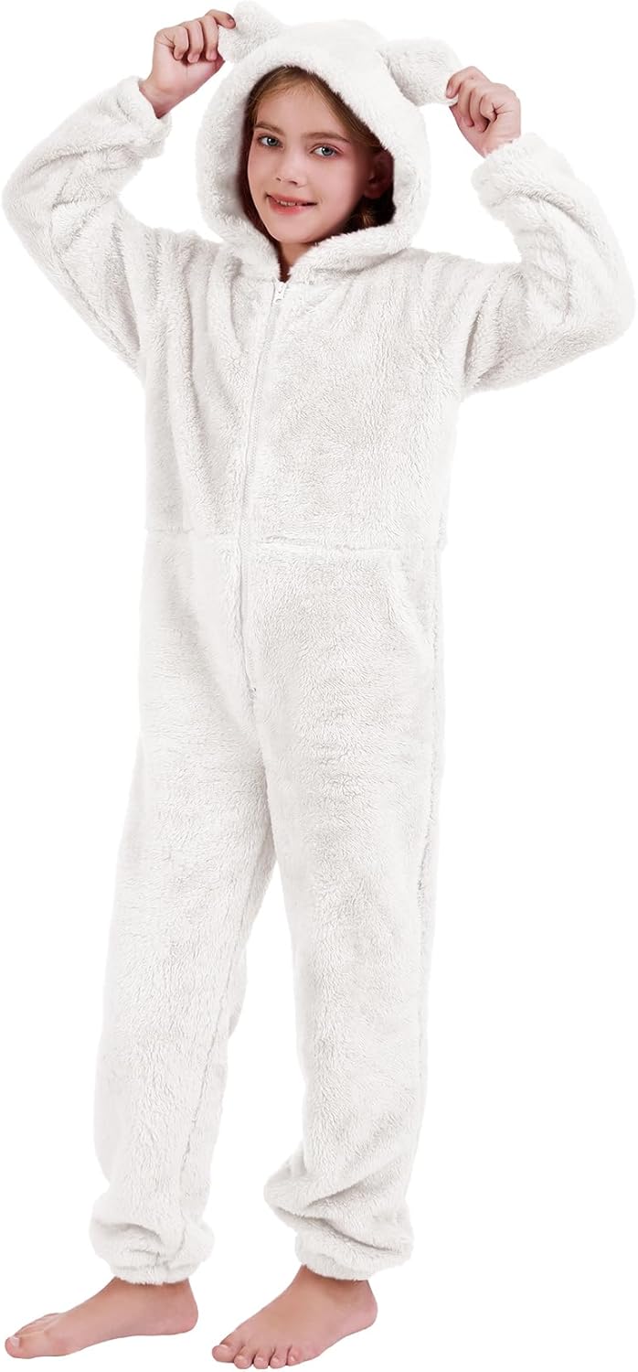 COZYPOIN Girls Fleece Zip Up Jumpsuits Kids Hooded Rompers Fuzzy Onesie Warm Cute Costume Winter Clothes