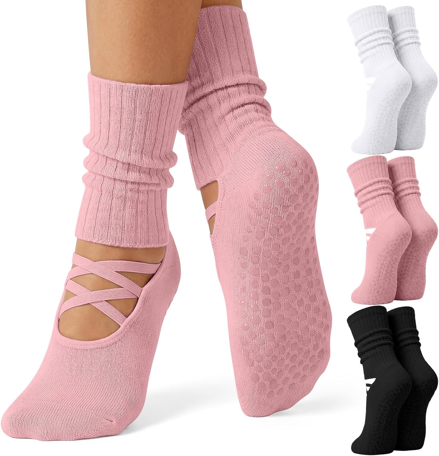Coume 3 Pairs Pilates Socks with Grips for Women Non Slip Grippers Yoga Crew Socks for Barre Workout