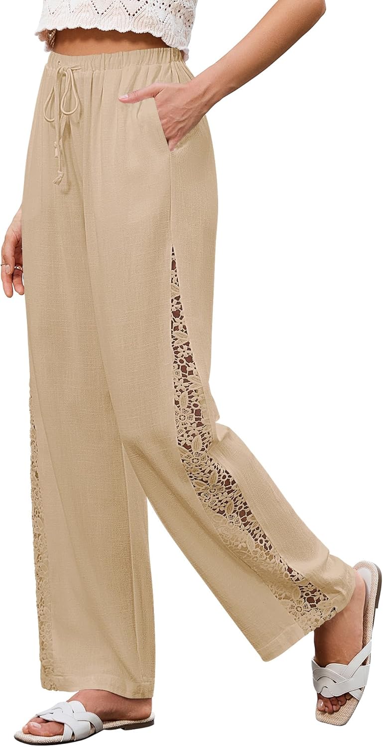 GRAPENT Linen Pants Women Wide Leg High Waisted Crochet Panel Pull On Elastic Waist Casual Summer Beach Vacation Pants