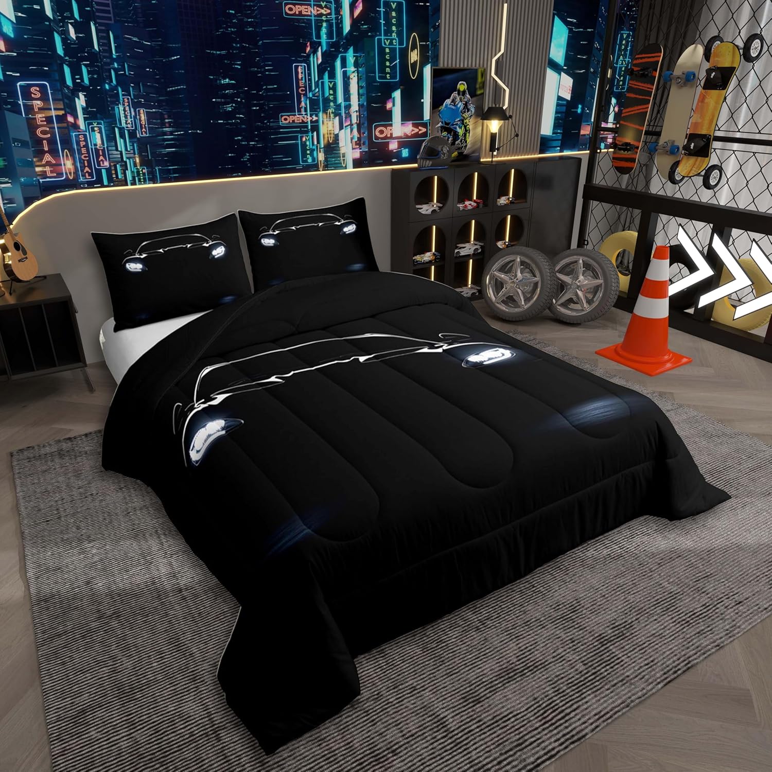 Black Race Car Comforter Set Twin Size,Race Car Room Decor for Boys,Sports Bedding Sets for Kids Boys Girls Teens,Cars Racing Games Bedding Comforter Set,Luxury Soft With 1 Pillow Case Bedroom Decor