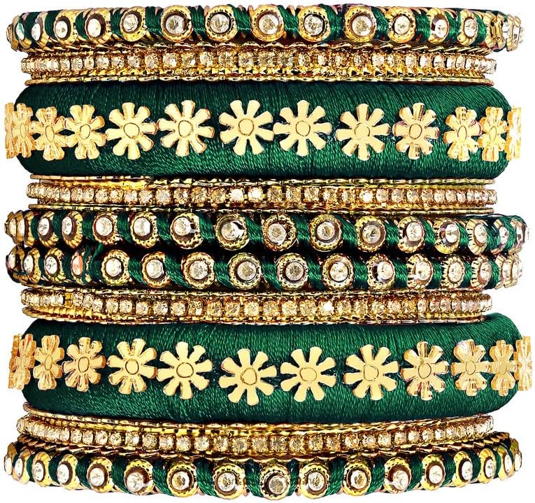 Aheli Synthetic Stone Studded 2.6 Inch Dark Green Silk Thread Bangles Set Ethnic Fashion Jewellery Gift for Women