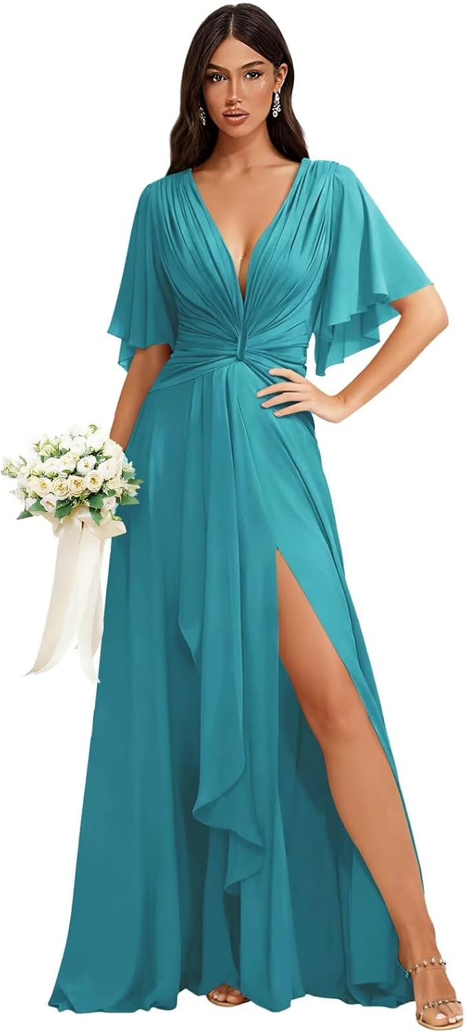 YHKDFGNZ Short Sleeve Bridesmaid Dresses Long Ruffles Chiffon V Neck Formal Wedding Guest Dress with Slit