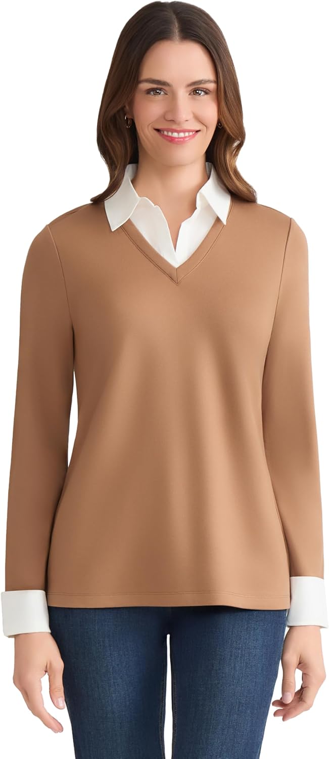 AmélieBoutik Women Faux Shirt 2 in 1 Style Long Sleeve Pullover Blouse Top