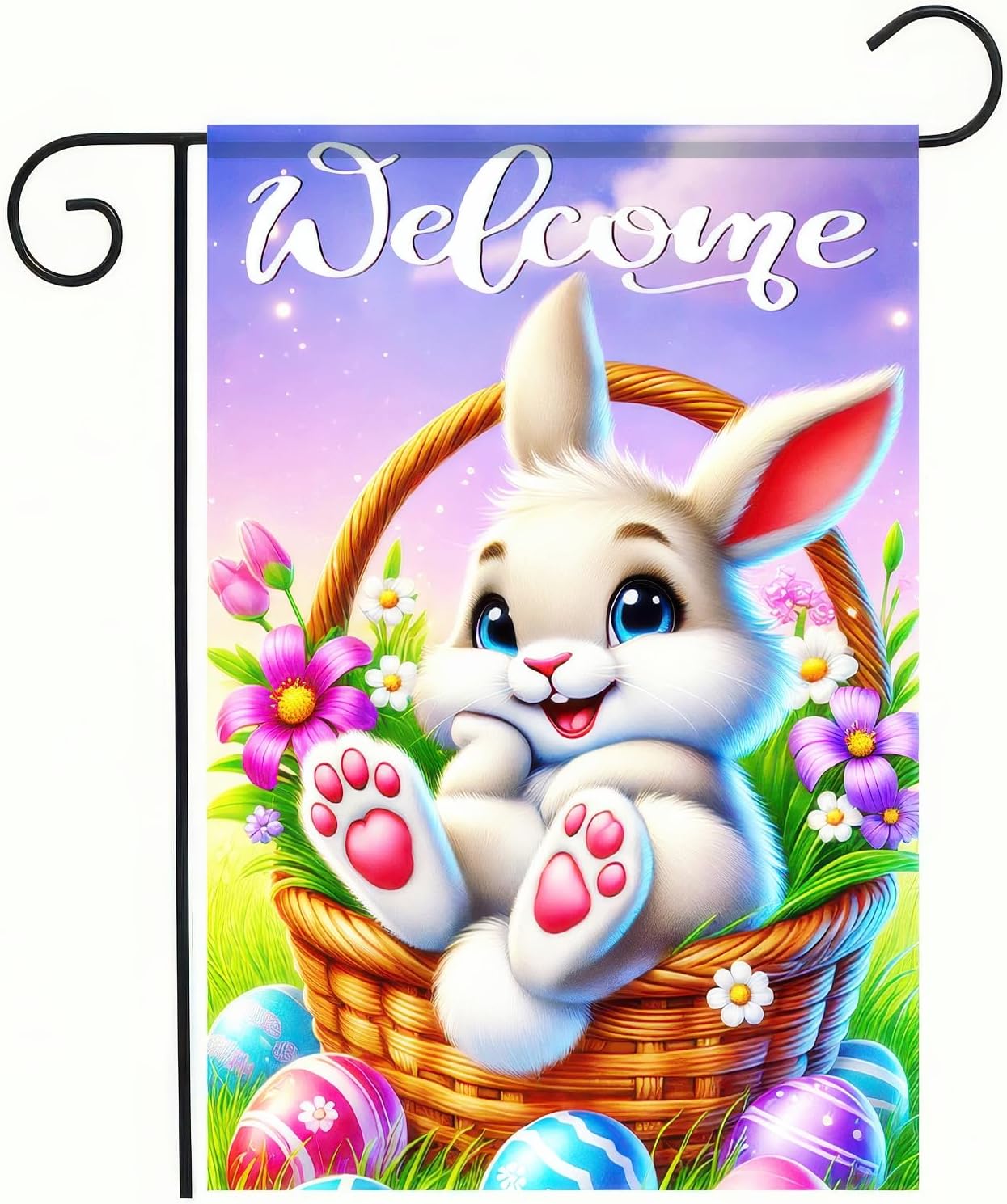 Welcome Easter Garden Flag 12x18 Double Sided Rabbit Happy Easter Bunny Garden Flag Yard Outdoor Flag Floral Flower Seasonal Decors for Spring Farmhouse Holiday Outside Decorative Banner