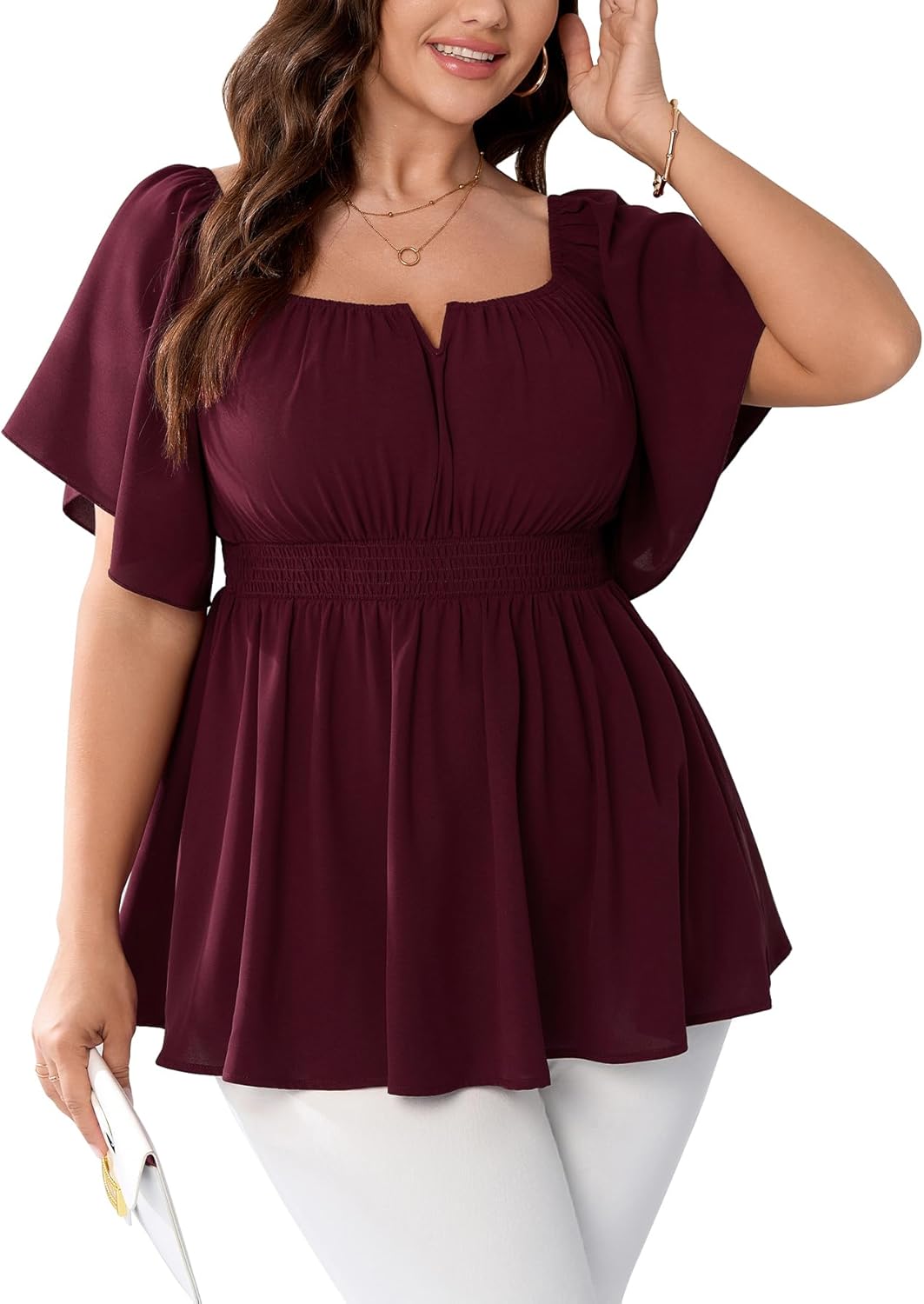 SCOMCHIC Womens Plus Size Peplum Tops Off The Shoulder Blouses Smocked Ruffle Babydoll Summer Top