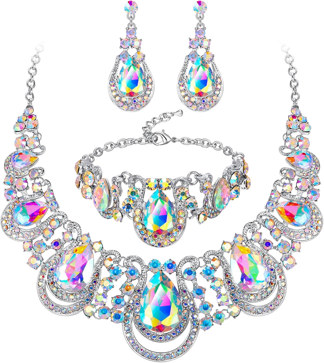 BriLove Women's Teardrop Crystal Statement Necklace Cluster Hollow Dangle Earrings Chain Bracelet Bib Jewellery Set for Wedding Bride Bridesmaid