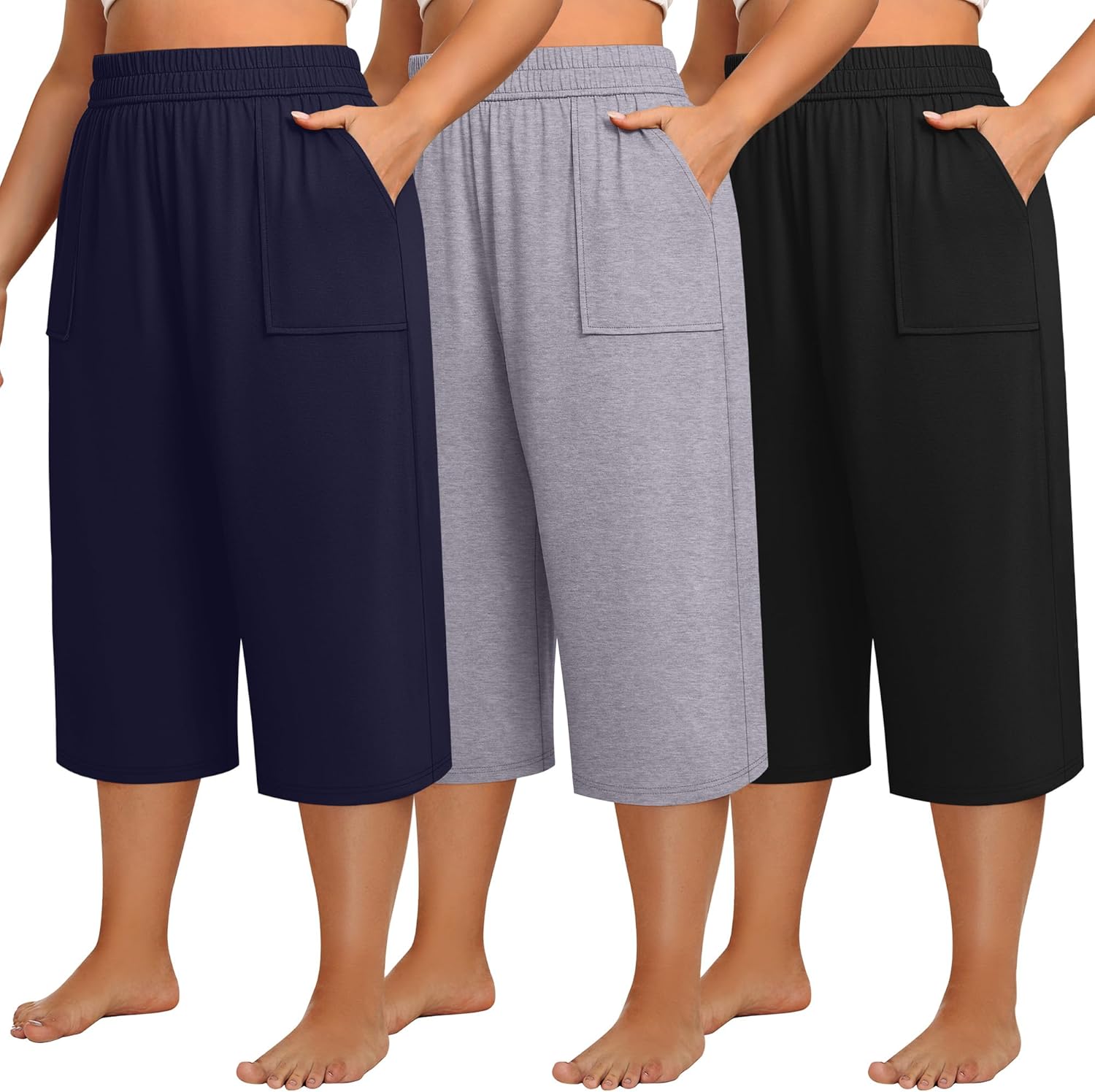 Neer 3 Pack Women Plus Size Capris Cotton Wide Leg Cropped Pants Casual Elastic Waist Loose Fit Lounge Sweatpants with Pocket