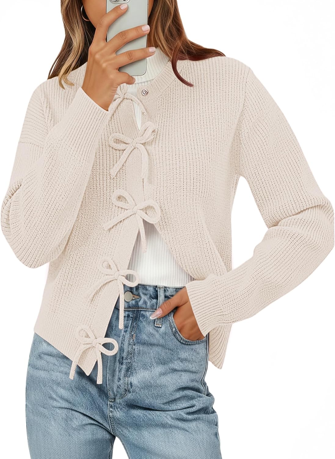 Women's Cardigan Sweaters Bow Button Down Cardigans Fall Fashion Clothes Knit Tie Open Front Coats