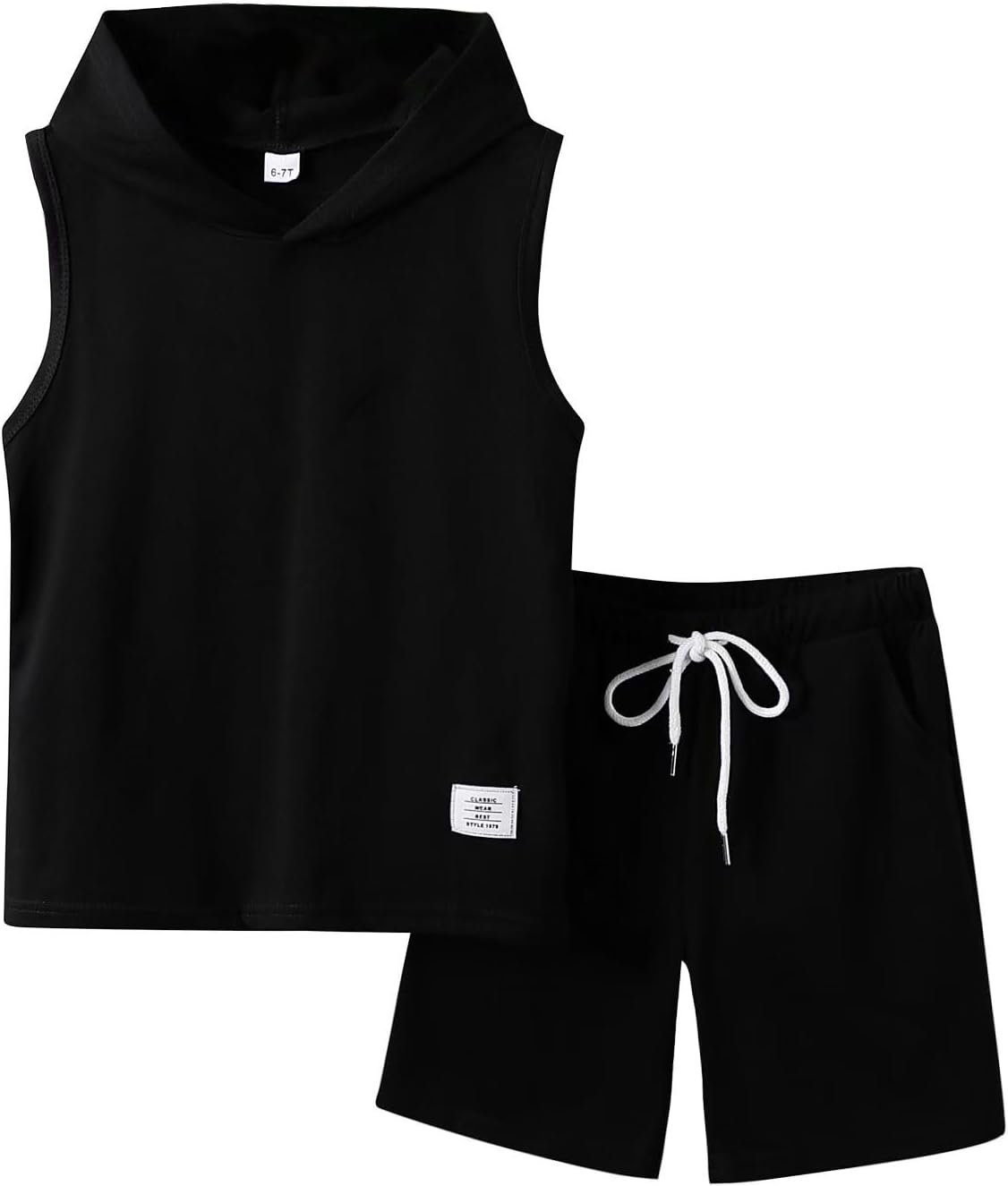 Size 6-12 Years Boys Summer Clothes Hooded Sleeveless Tank Tops Workout Shorts 2 Piece Set Fashion Outfits