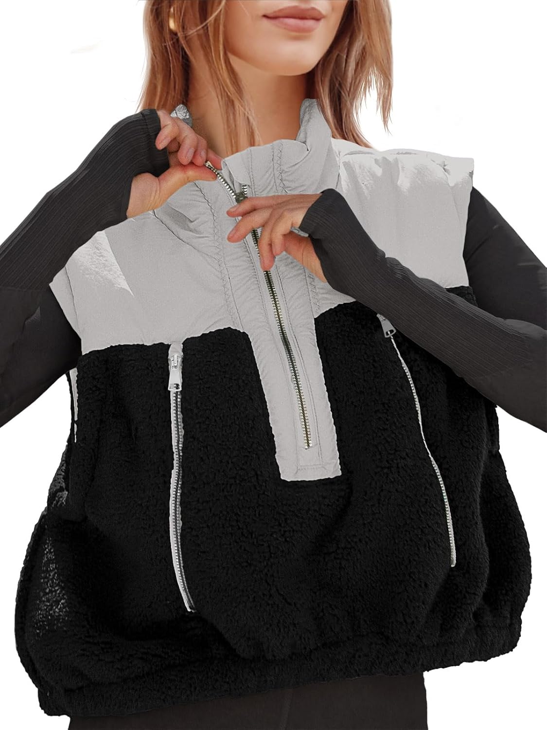 Tankaneo Womens Cropped Vests Outerwear Color Block Half Zipper Fleece Sherpa Sleeveless Winter Coats Jackets with Pockets