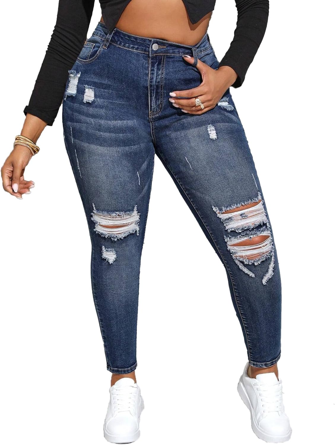Womens Plus Size Skinny Jeans Stretchy High Waisted Ripped Distressed Ankle Jean
