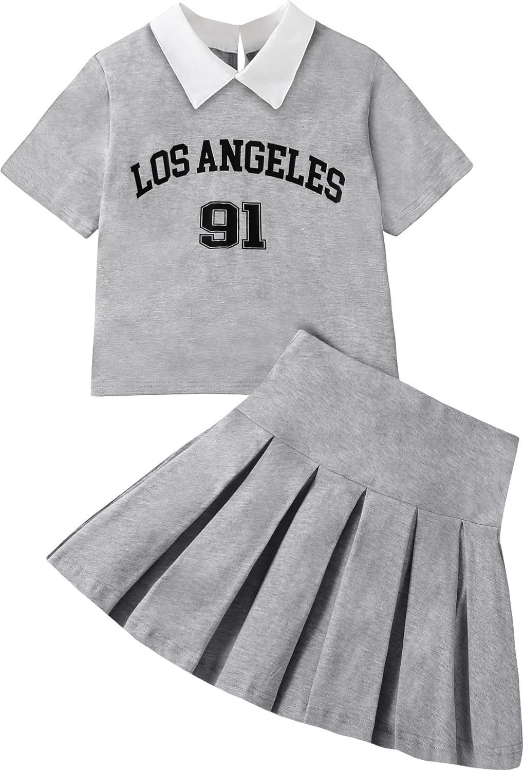 Girls 2 Piece Outifit Short Sleeve Graphic Top Polo Shirt and Pleated Skirt Set