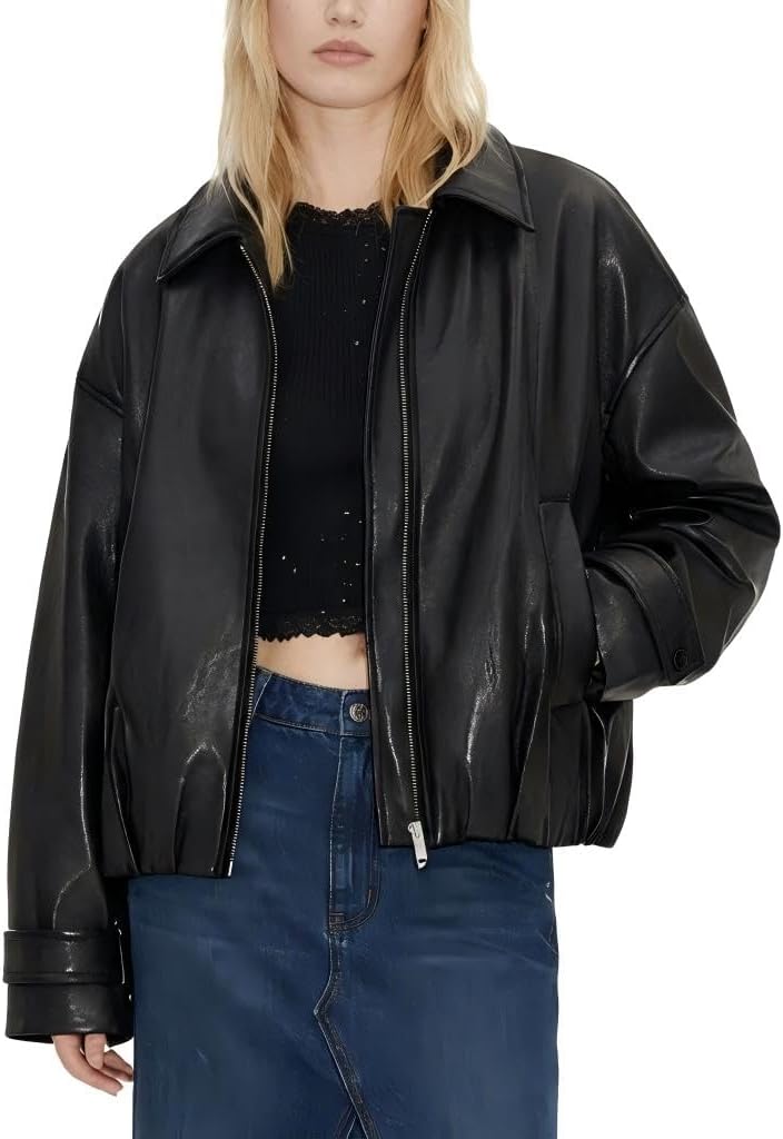 Oversized Faux Leather Bomber Jacket for Women – Zip-Up Aviator Flight Coat, Relaxed Fit Streetwear Outerwear