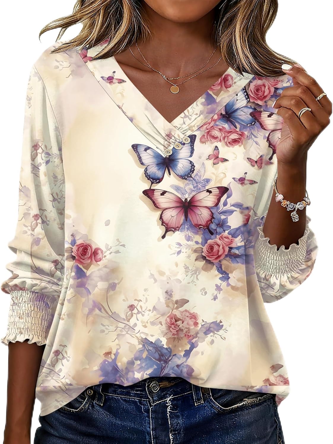 LOMON Blouses for Women Dressy Casual 3/4 Length Sleeve Womens Tops with Buttons Decor