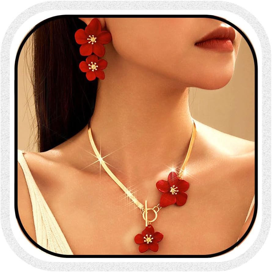 Flower Necklace Earrings Set Statement Foral Jewelry Set Wedding Snake Chain Necklace for Women