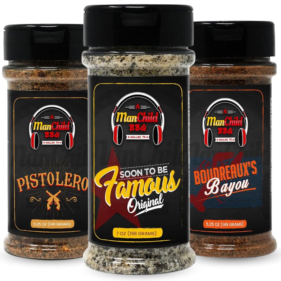 - Three Spice Blends: From the heart of Texas BBQ country, we bring you our three most popular spice blends: "Soon-To-Be-Famous, Pistolero, and Boudreaux's Bayou." Whether you're a beginner or a pro, these spices will add that perfect flavor to your meat