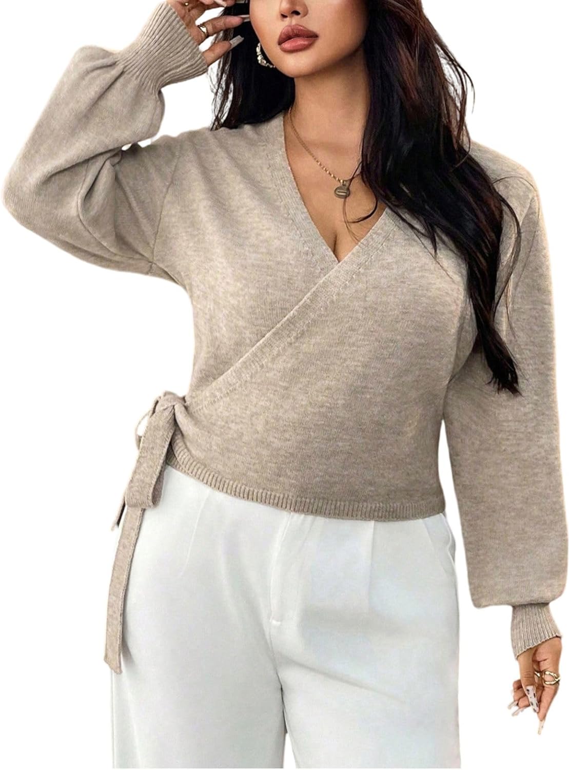 Verdusa Women's Plus Size Wrap Sweater Tie Knot Cropped Cardigan Lantern Long Sleeve Knitted Sweaters