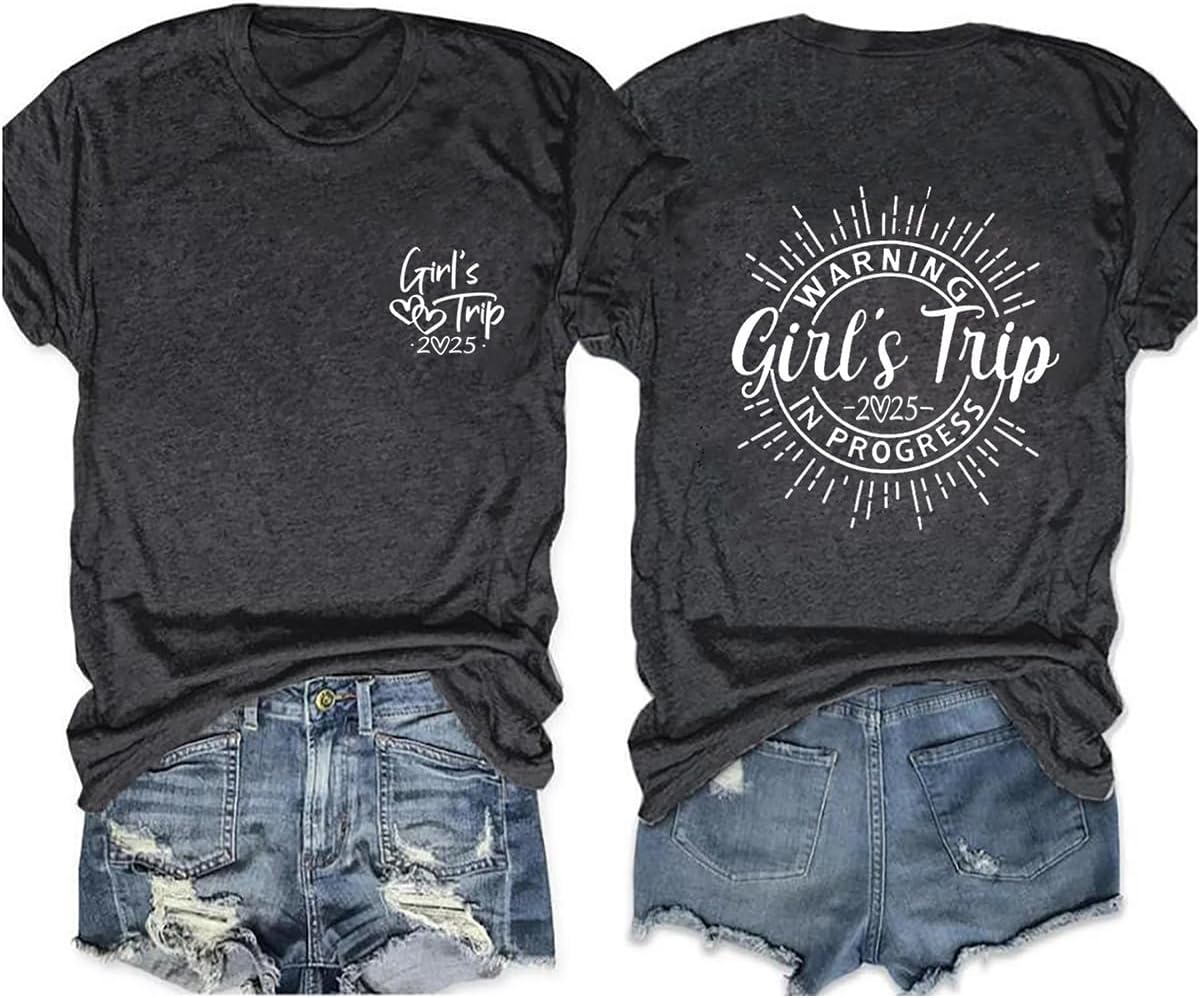 Women's Warning Girls Trip in Progress T-Shirt Casual Adventure Hiking Vacation Camping Short Sleeve Graphic Tee Tops
