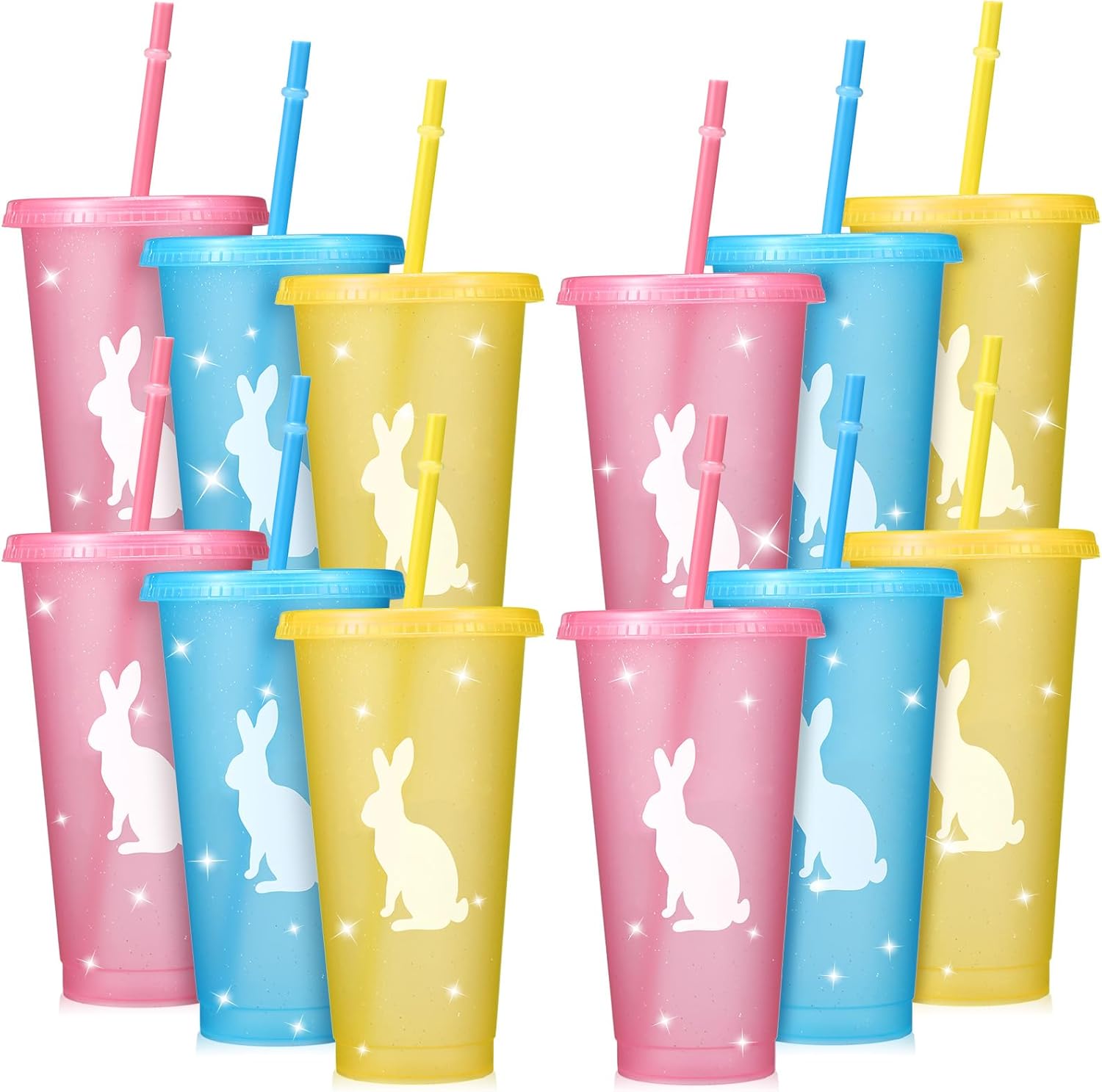 Qinyoung 12 Pack Easter Plastic Tumblers with Lids and Straws 24 oz Easter Bunny Cups Bulk Colorful Reusable Cups for Easter Party Favors Supplies Beverage Ice Coffee Beer Juice