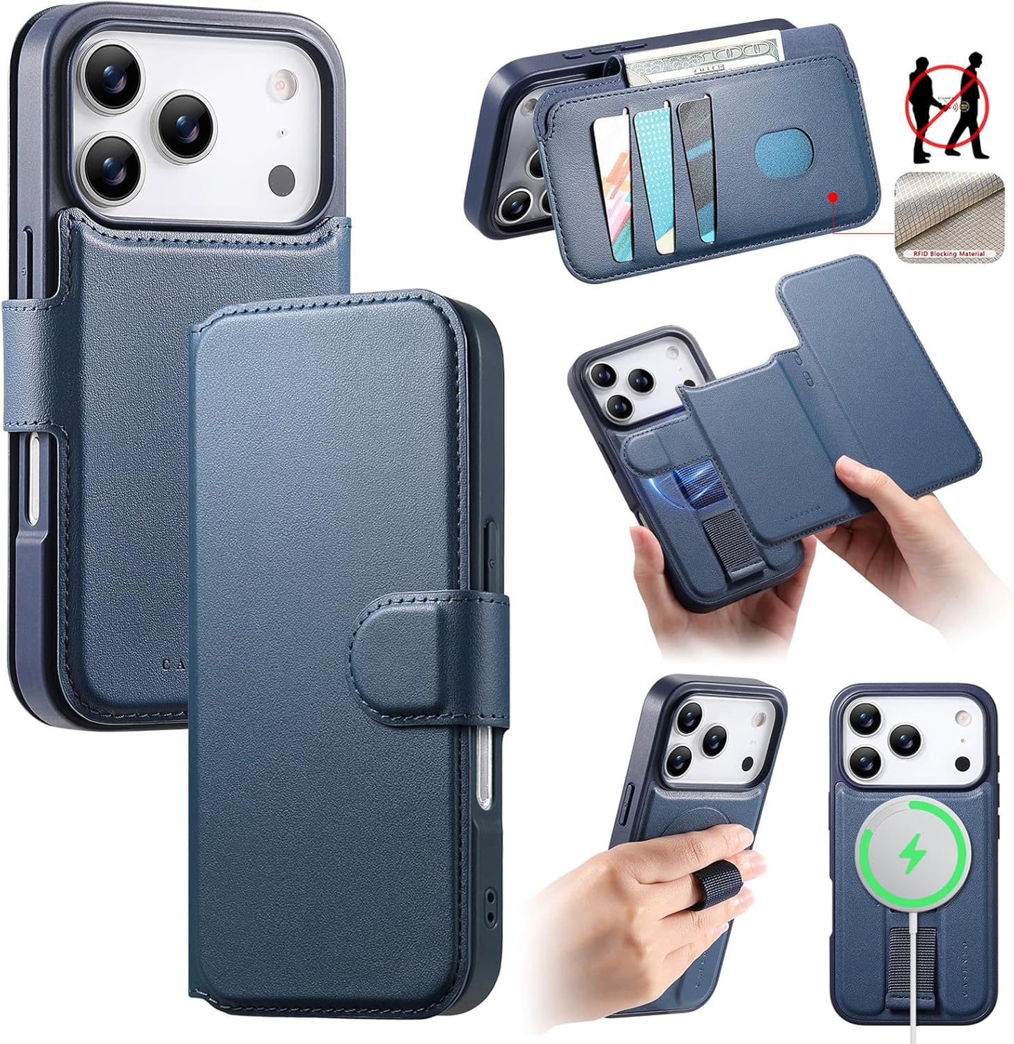 for iPhone 17Pro Wallet Case, Leather Detachable Magnetic 2 in 1 Case with MagSafe Wireless Charging,Kickstand RFID Blocking Credit Card Slots Blue