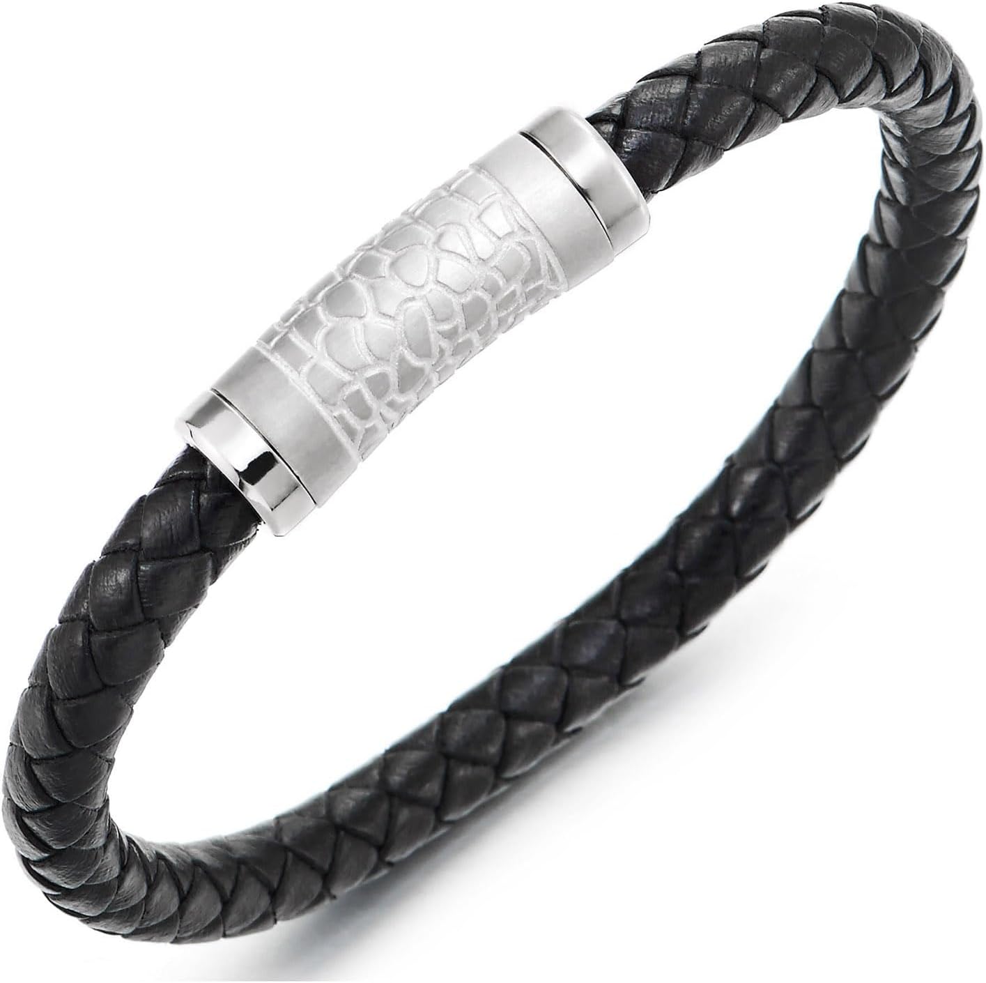 Men’s Black Braided Leather Bracelet with Steel Textured Barrel Clasp Modern Minimalist Wristband