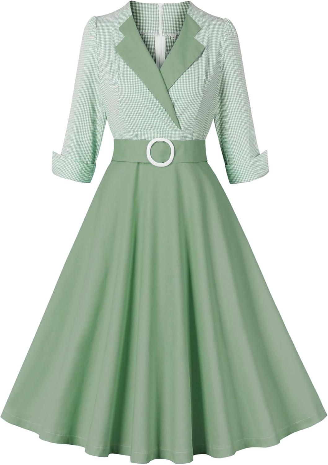 Women's Vintage Tea Dress V-Neck 3/4 Sleeves Plaid A-Line Cocktail Party Dress