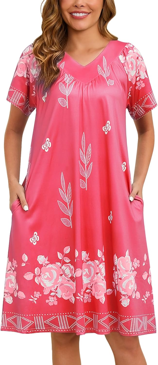 Marvmys Womens House Dress Short Sleeve Nightgown Floral Print Mumu Dress with Pockets V Neck Sleepwear S-3XL