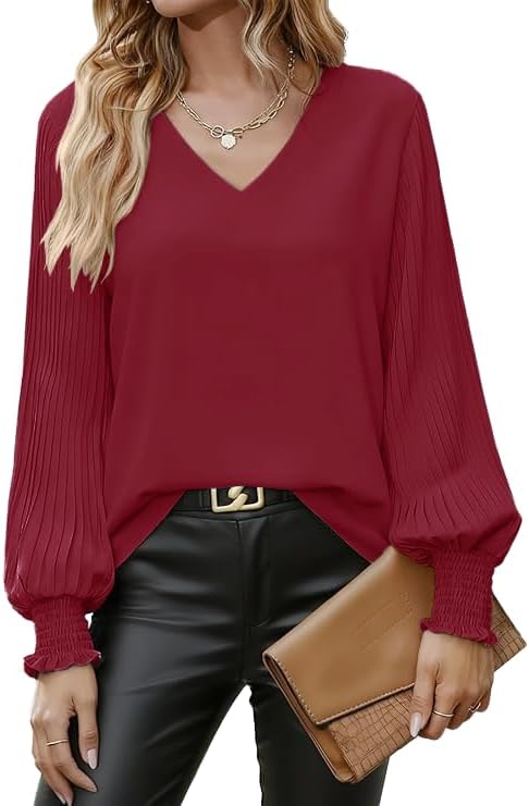 Aifer Womens V Neck Chiffon Blouses Pleated Lantern Sleeve Flowy Dressy Tops Elegant Business Casual Outfits