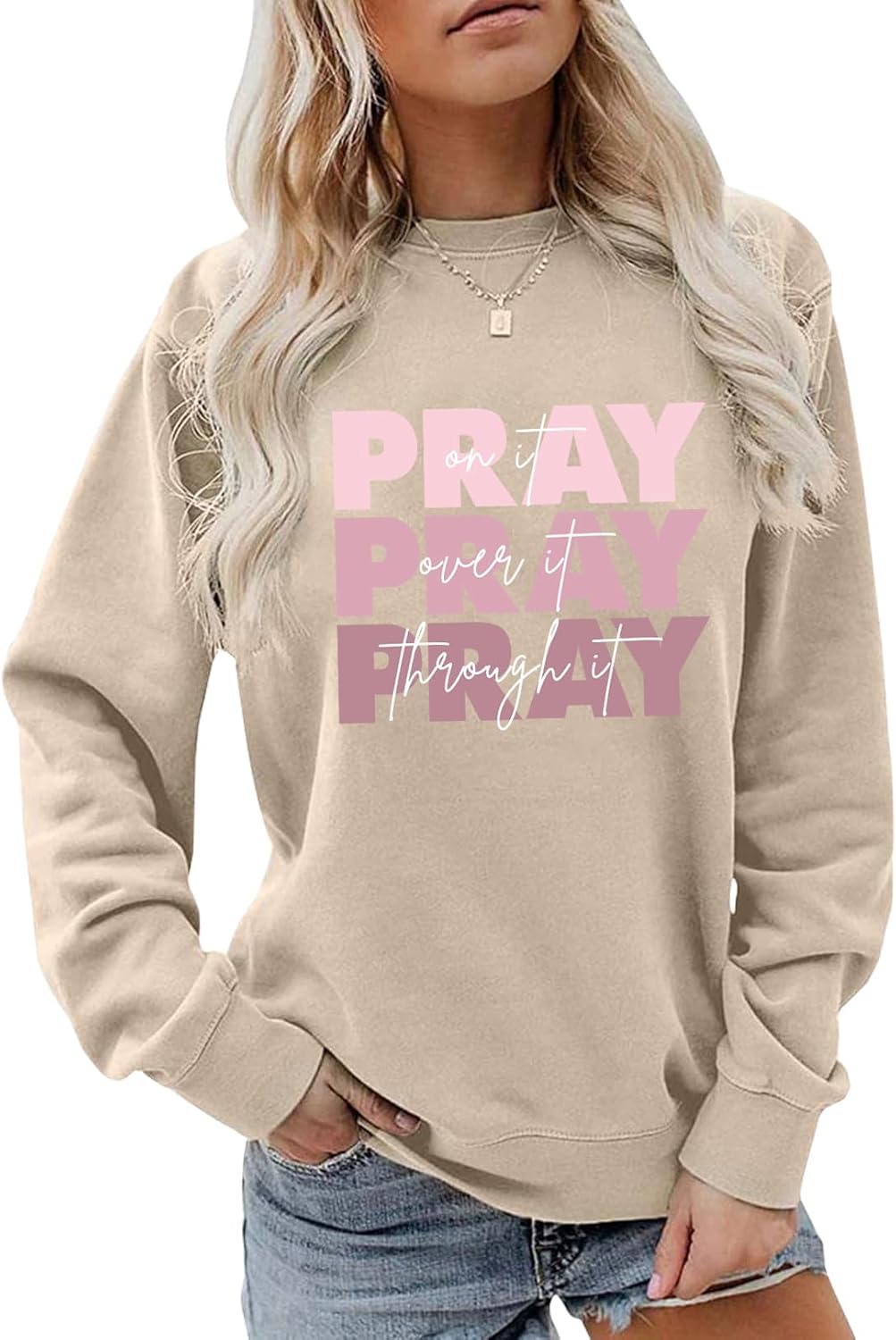WESEOOU Christian Sweatshirt Women Pray On it Over it Through it Crew Neck Religious Faith Pullover Inspirational Tops